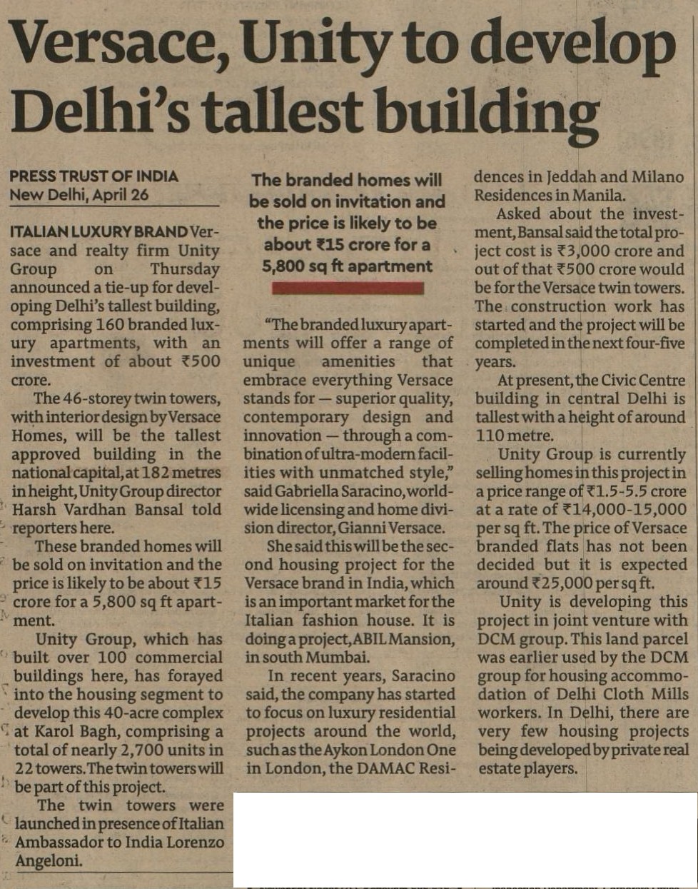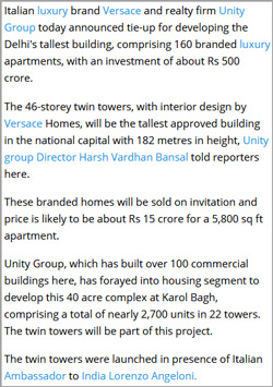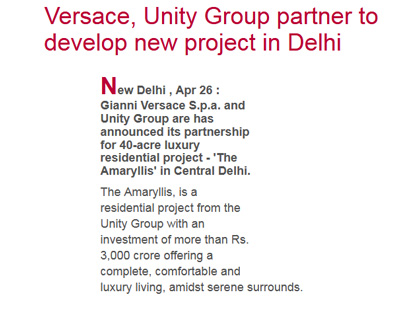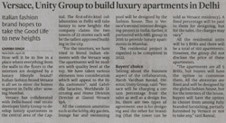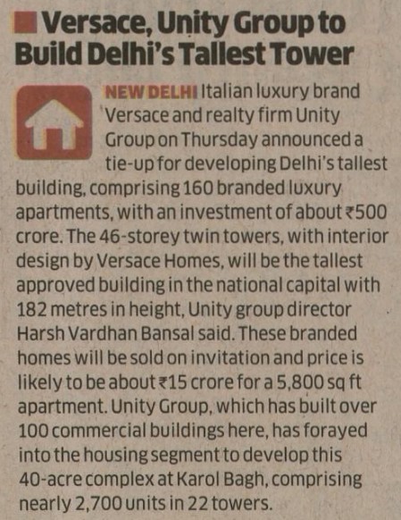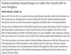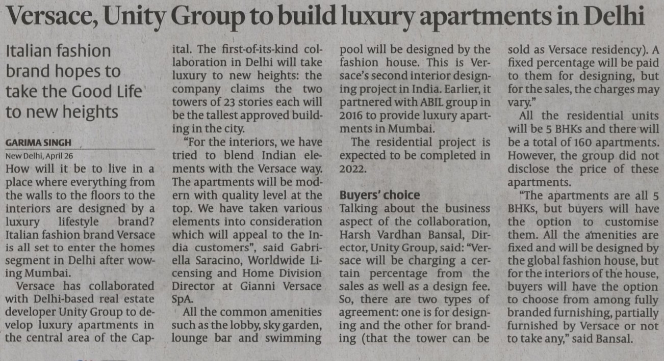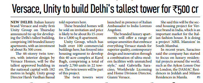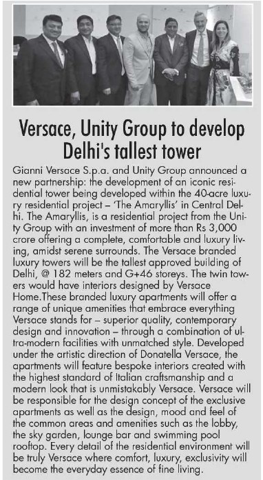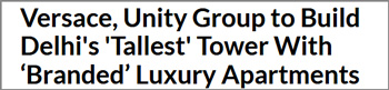 ITALIAN LUXURY BRAND VERSACE AND REAL ESTATE DEVELOPER UNITY GROUP PARTNER TO DEVELOP RESIDENTIAL TOWER IN DELHI