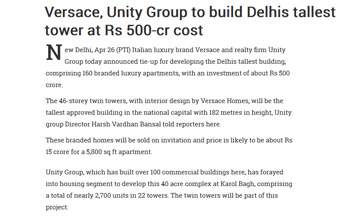 Versace, Unity Group to build Delhi's 'tallest' tower at Rs 500-cr cost