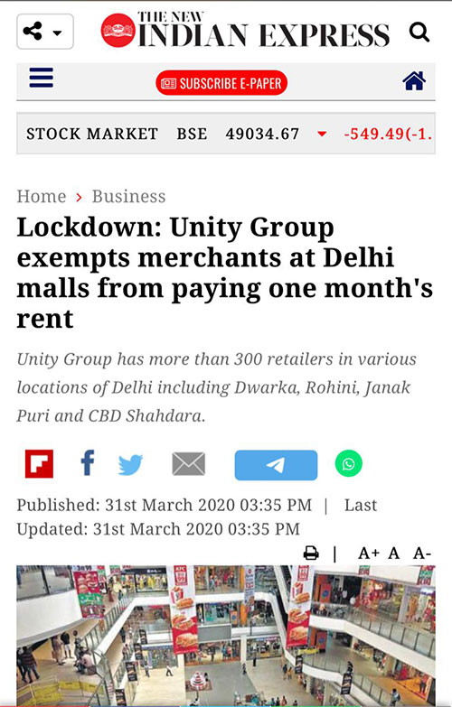 Lockdown: Unity Group exempts merchants at Delhi malls from paying one month's rent
